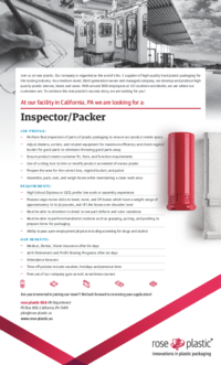 - Perform final inspection of parts of plastic packaging to ensure our product meets specs